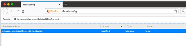 To open new links at the end of the bar, type browser.tabs.insertRelatedAfterCurrent in the search bar and set its value to “false”. Once done, whenever you click on a link to open in a new tab, it will be opened at the end of the bar.