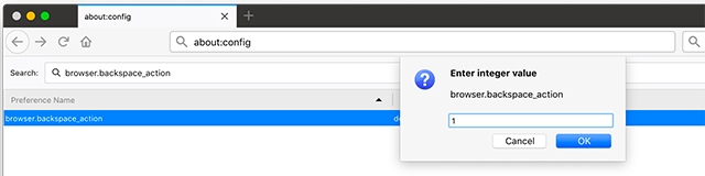 To change the action of the backspace button, type “browser.backspace_action” inside the search bar of the settings page. On the matching option that appears on the list, either right-click and select “Modify” or just double-click to modify the settings.