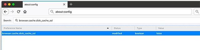 Enter browser.cache.disk_cache_ssl in the search bar and double-click on the value to set it to “false”. Now all the data on encrypted websites will not be downloaded as cache in Firefox but this will increase the load times, as encrypted pages will need to be downloaded every time you open them.