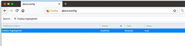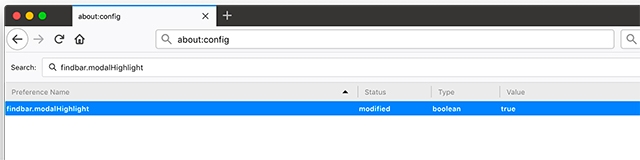 To toggle the feature, enter findbar.modalHighlight in the search bar on about:config page. To activate the setting, either double-click on the option or right-click and select Toggle and the value will change to “true“. This is how the page looks when the highlight feature is turned on.