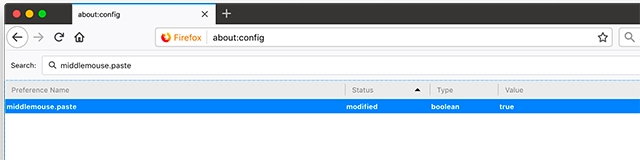 Type middlemouse.paste and double-click on the setting that shows up to set it to “true”. Now you can simply press the middle mouse button to paste content copied to the clipboard. Although, it will only work inside the Firefox browser.