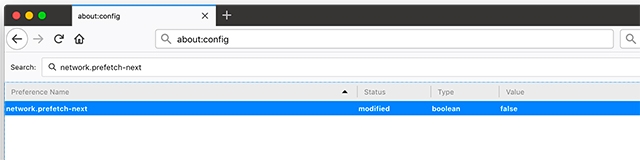 To disable Firefox Prefetch, type network.prefetch-next and double-click on it to set its value to “false”. This may slow down page loading a bit but it will stop Firefox from downloading unnecessary data and maintaining your privacy.