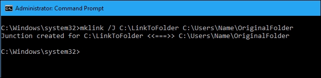 mklink /J C:\LinkToFolder C:\Users\Name\OriginalFolderYou’ll need to put quotation marks around paths with spaces. For example, if the folders are instead named “C:\Link To Folder” and “C:\Users\Name\Original Folder,” you’d use the following command instead: